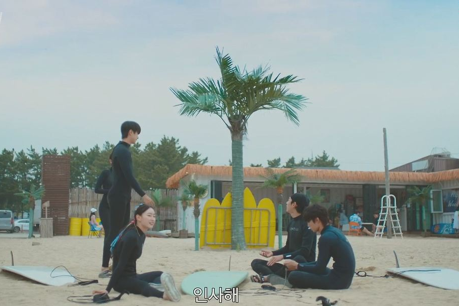 - 장면 설명: 서핑을 배우는 장면으로, 청춘과 도전의 상징 같은 공간.