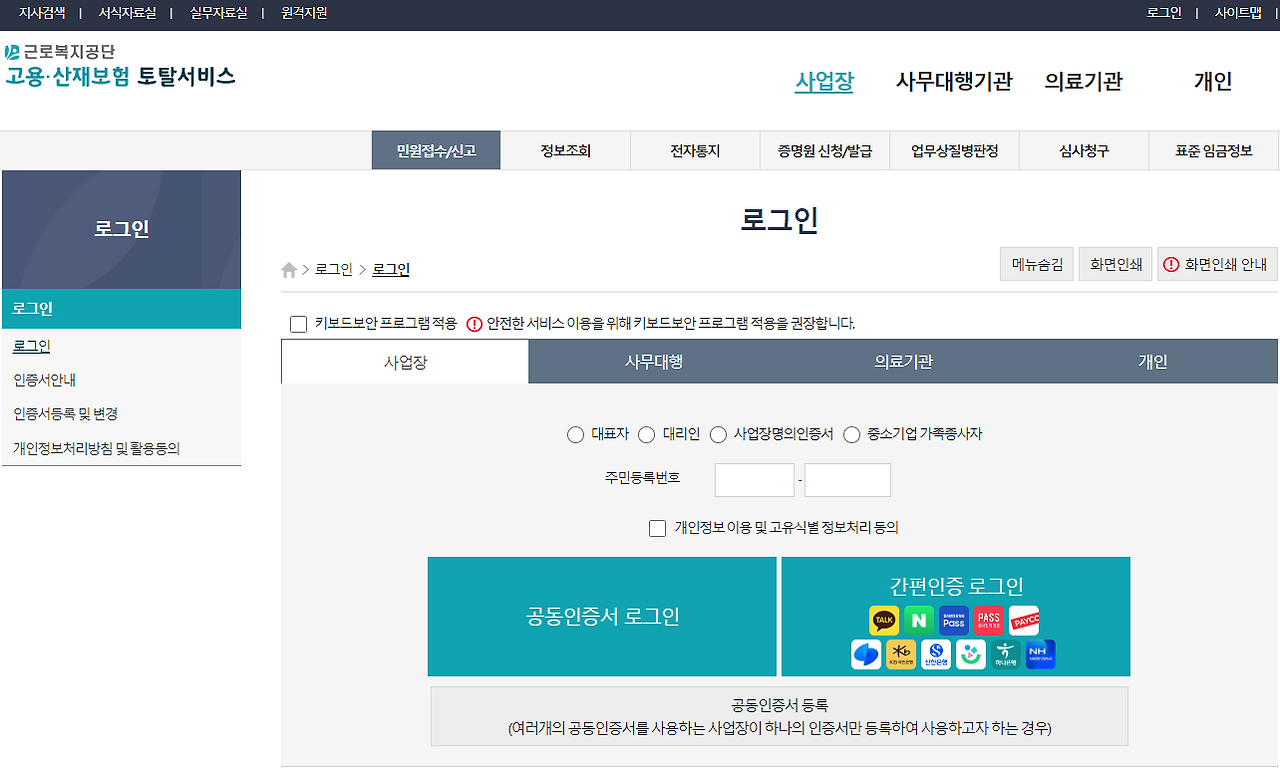 - 로그인 : 고용-산재보험 토탈서비스 접속 후 사업주 인증(공동인증서/간편인증 등 사업장 환경에 맞게)