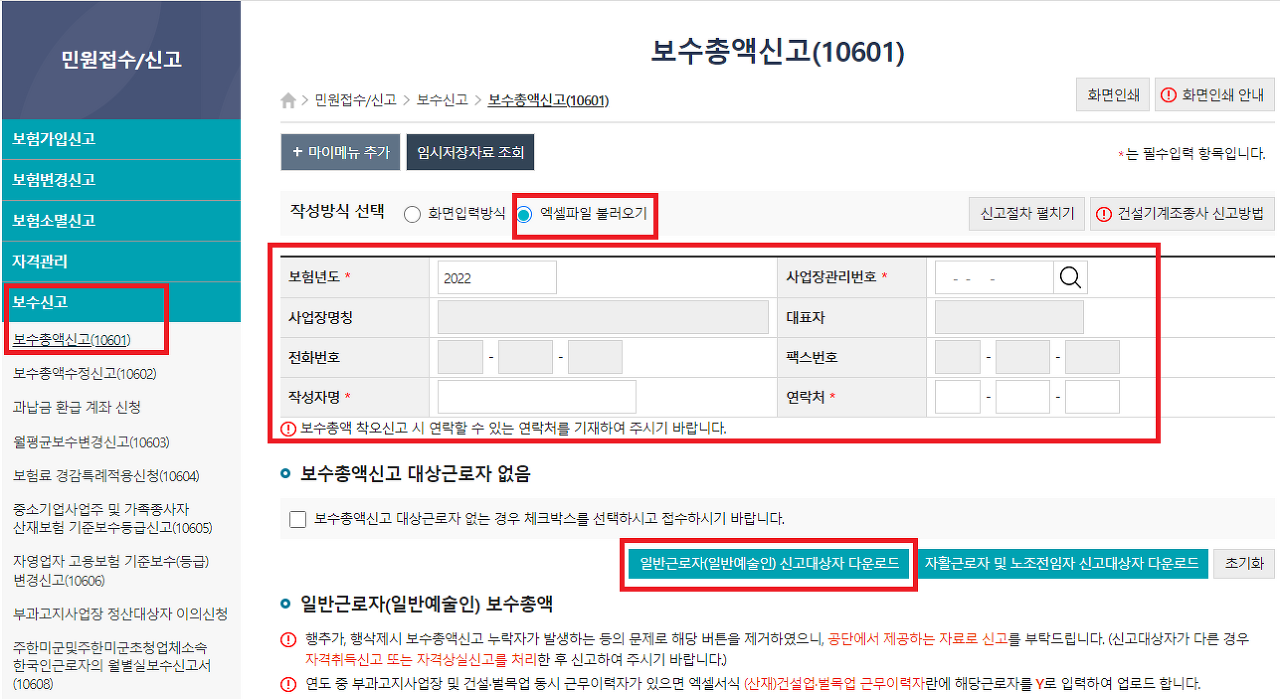 - 대상자 다운로드 : 사업장관리번호 기준으로 신고 대상자 리스트를 내려받아 기본정보를 고정