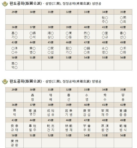 이처럼 소정공파는 이름만 하나일 뿐, 실제 내부 항렬 체계는 상당히 복층적입니다. 따라서 소정공파 후손이라 하더라도 정확한 장방, 이방, 구방, 장령공계, 영천부원군계 등을 구분해야 항렬 해석이 가능합니다.