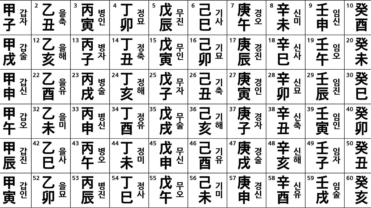 먼저 60갑자의 전체 순서를 한 번에 정리하면 다음과 같습니다.