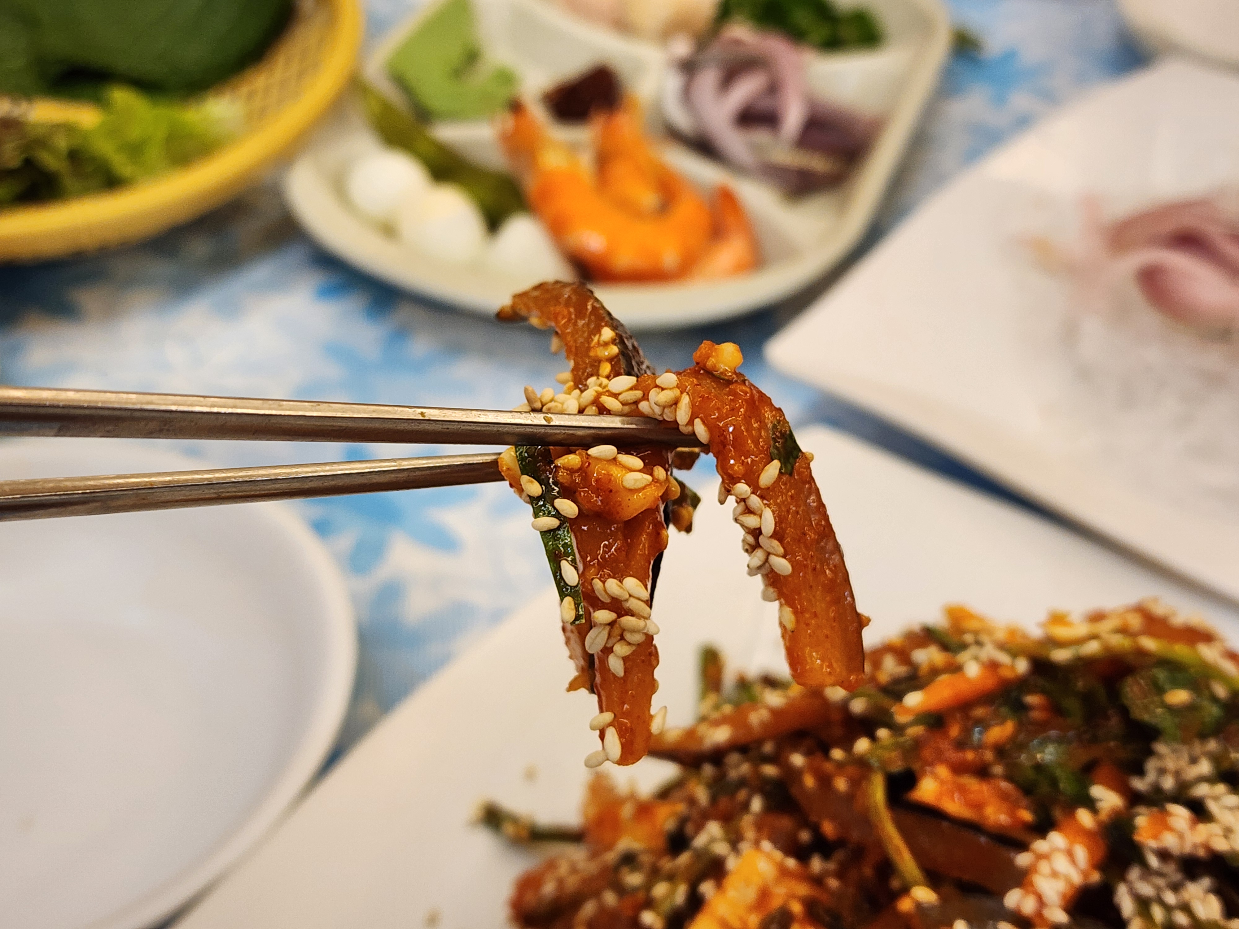 전어무침은 특히 이 집의 자부심이라 할 수 있습니다. 단순히 초장에 버무린 게 아니라, 회의 두께감과 채소의 밸런스가 완벽합니다. 대부분의 횟집은 무침 속 회 양이 적은 편인데, 청강호의 전어무침은 회가 듬뿍 들어가 있어 젓가락질마다 생선살이 차오릅니다. 새콤달콤한 양념이 과하지 않아, 전어 본연의 감칠맛이 살아 있습니다.