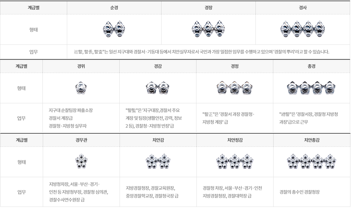 다만, 명칭이 ‘급수’가 아닌 ‘계급’으로 되어 있으며, 경찰 업무 특성상 직무 계층별로 강력한 지휘체계가 구성돼 있습니다.