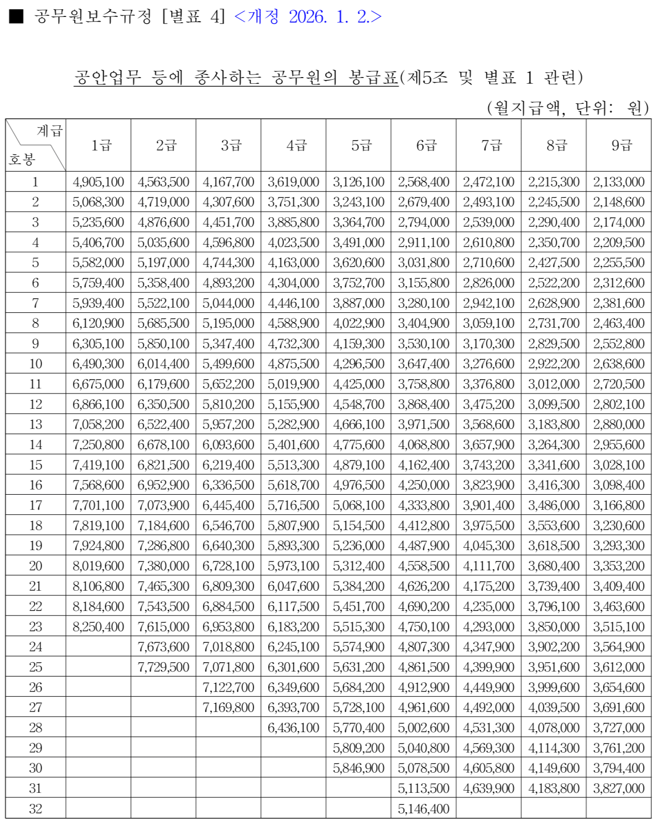 2026년 개정된 봉급표는 다음과 같은 특징적인 금액 변화를 보입니다.