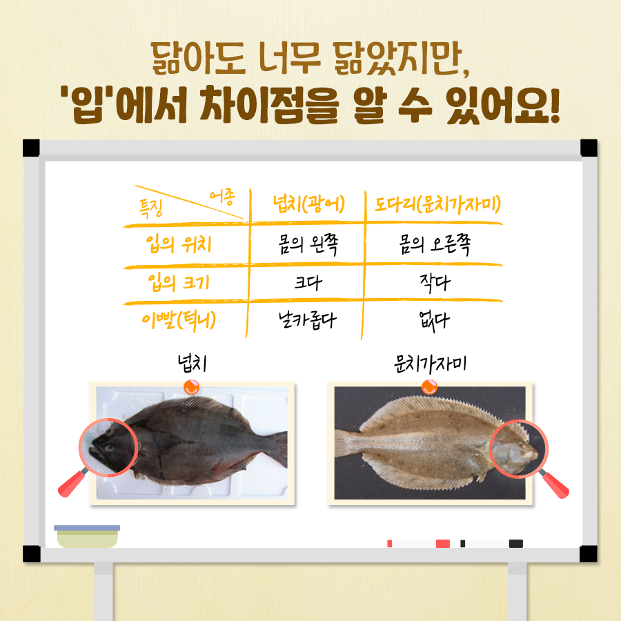 - 도다리·가자미: 눈이 오른쪽에 몰려 있음
