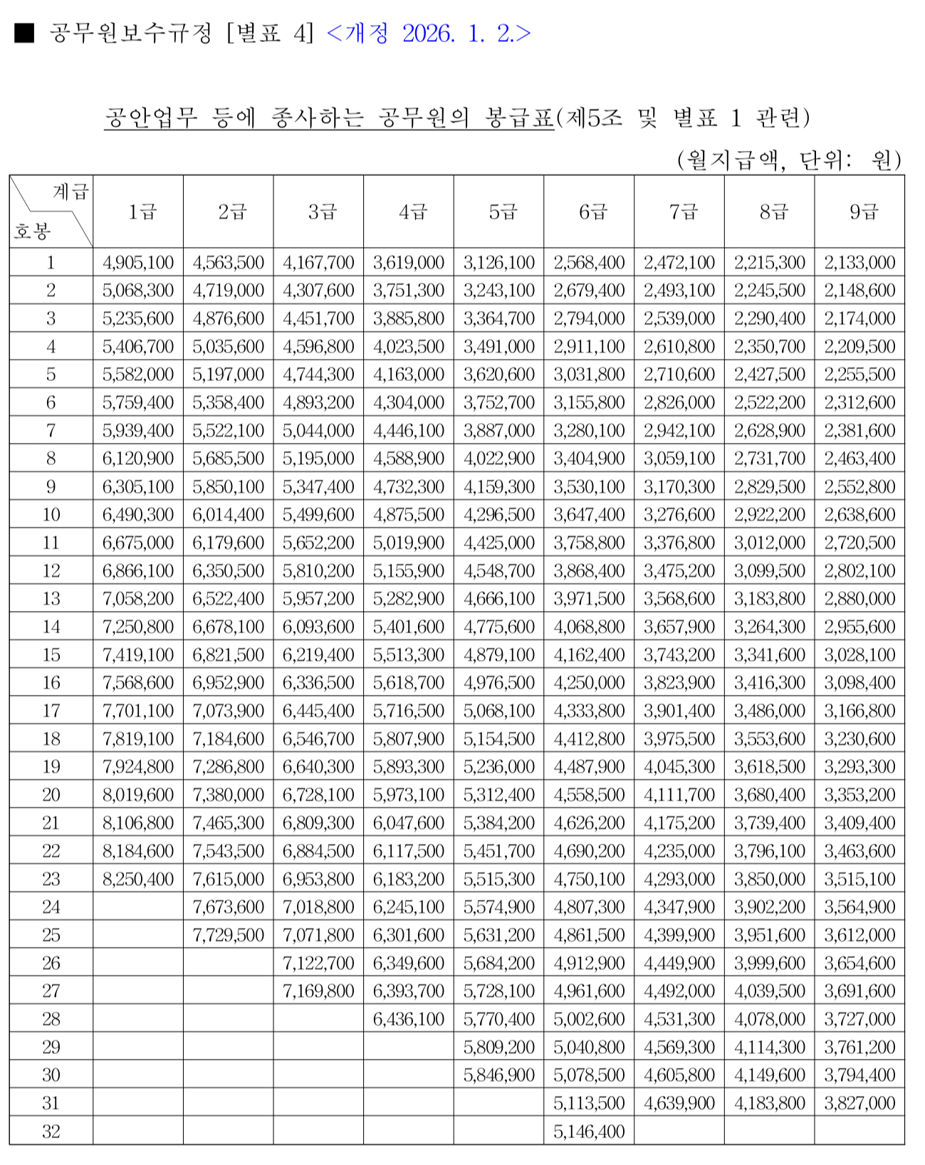 공안업무 종사 공무원 봉급표 2026 읽는 법(월지급액)