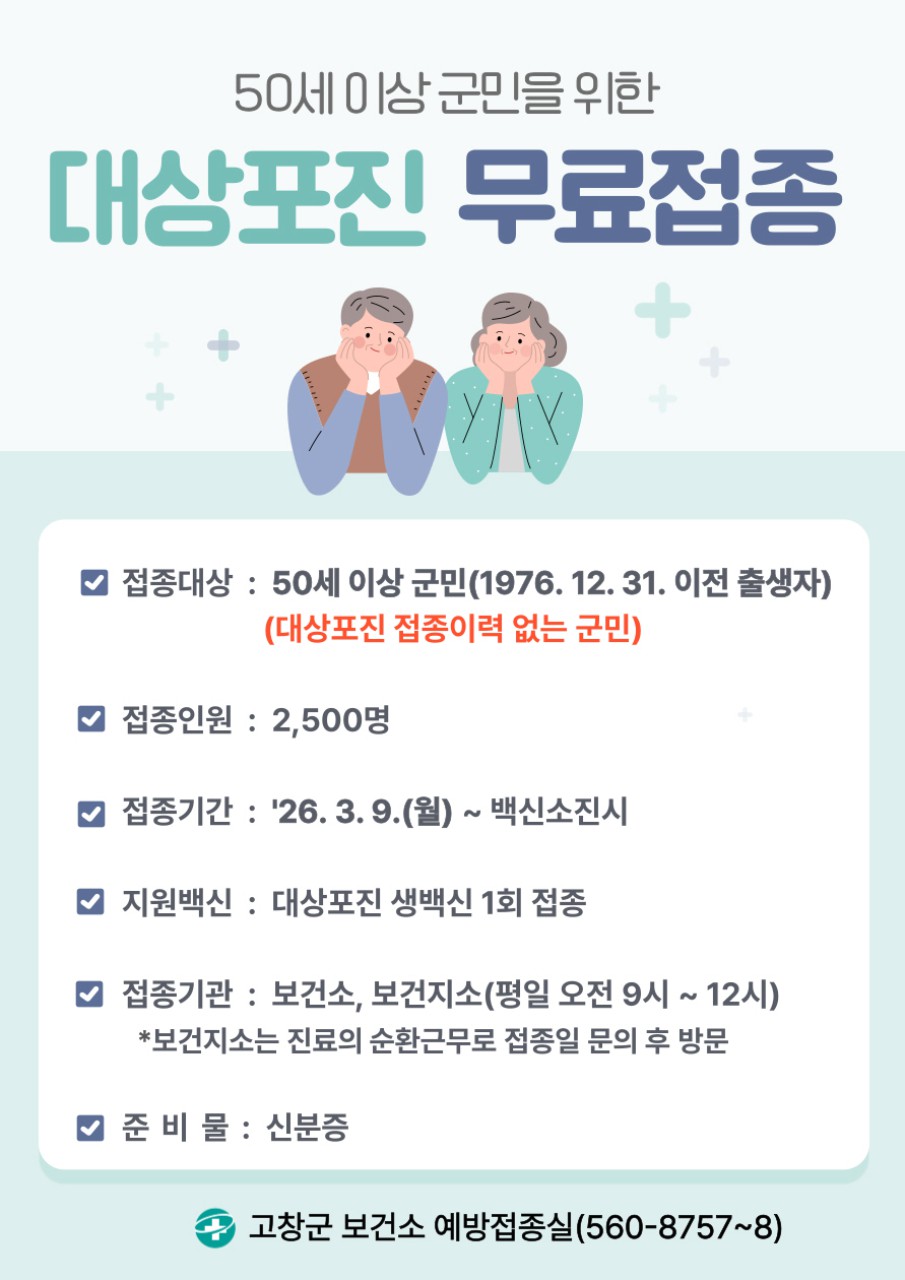 나이가 들수록 면역력이 자연스럽게 감소하기 때문에 50세 이상에서는 대상포진 발생 위험이 급격히 높아집니다. 특히 대상포진은 단순 피부 질환이 아니라 신경을 따라 심한 통증을 유발하는 질환이기 때문에 예방이 매우 중요합니다. 이러한 이유로 많은 지자체에서는 일정 연령 이상의 시민에게 대상포진 예방접종 지원 사업을 시행하고 있으며 일부 계층은 무료 또는 저렴한 비용으로 접종을 받을 수 있습니다.