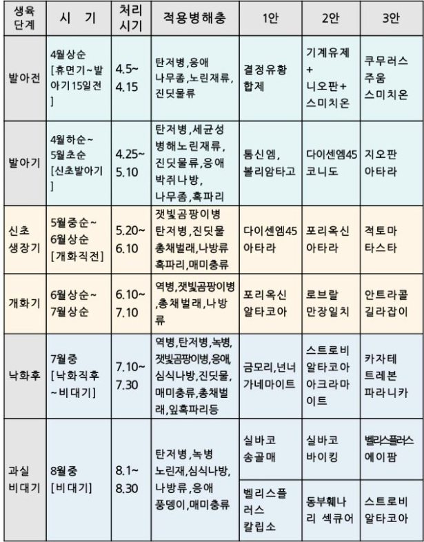 • 10월 수확 직후 톱신·벤레이트 수화제, 4월 초 석회유황합제 5도액 집중 살포