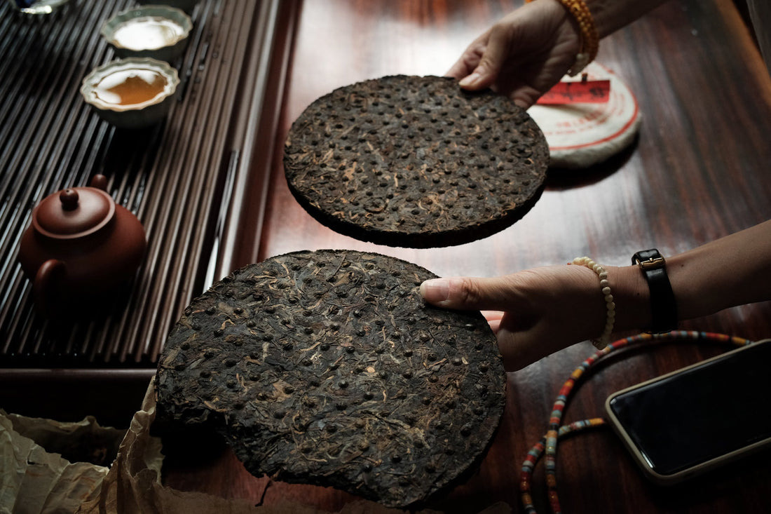 - 긴압(투차) 형태는 3 g, 산차는 4 g 정도를 150 ml 다관 기준으로 덖어둡니다. 차 도구에 잔분이 남지 않도록 티툴(차칼)로 조심히 떼어내세요.