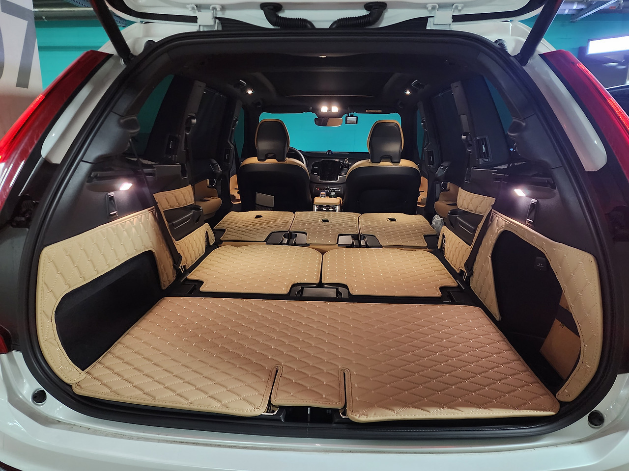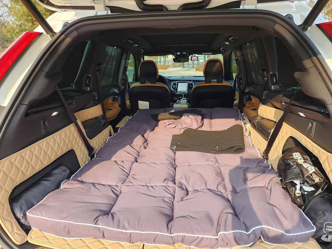 XC90은 차박용 SUV로도 매우 적합합니다. 2열과 3열을 완전히 폴딩하면 거의 평평한 바닥 공간이 확보되어, 성인 2명이 편하게 누울 수 있을 만큼 넓은 평탄화를 제공합니다.