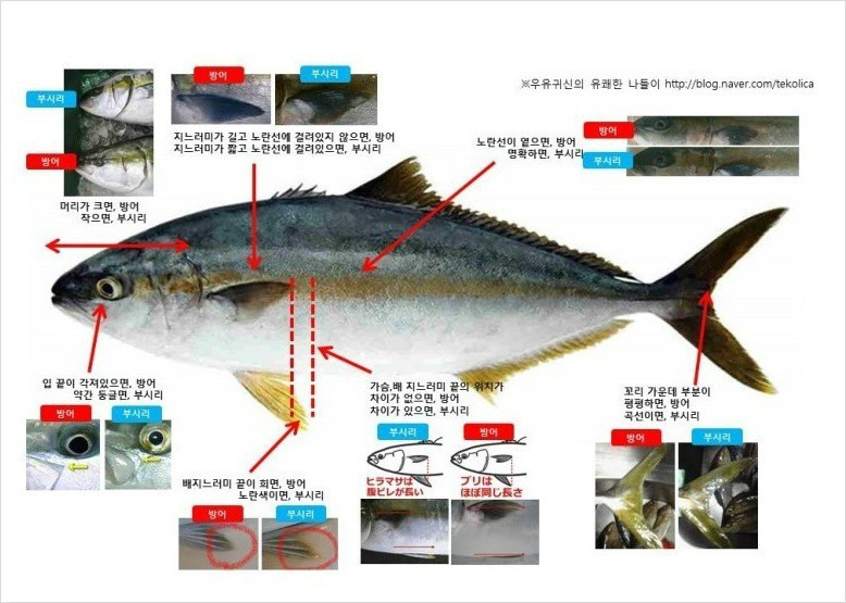 - 이 부시리 방어 구별법은 손질 전 생물 상태, 수조 속 활어 상태에서도 확인 가능해 가장 신뢰도가 높습니다.