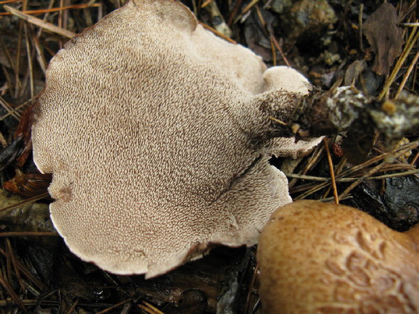 - 형태: 어두운 갈색의 둥근 갓, 아래는 침 모양 포자