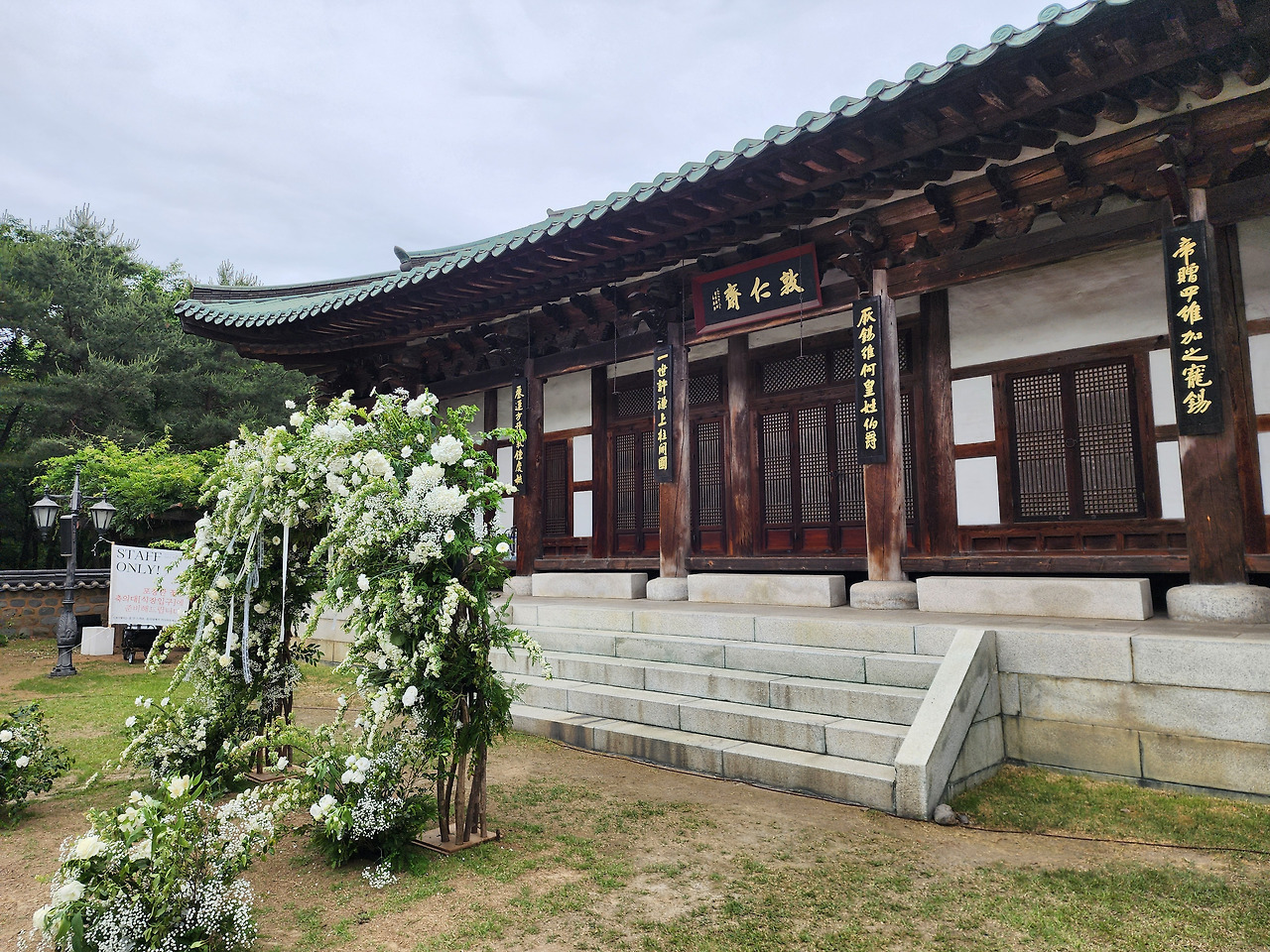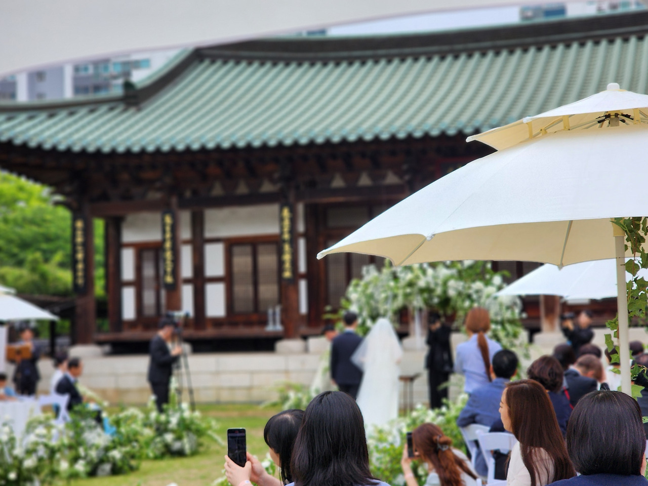 또 하나 기억할 만한 부분은 예식 후 장식 꽃을 하객이 꽃다발처럼 가져갈 수 있도록 운영하는 방식입니다. 이는 단순한 장식 소모가 아니라 결혼식의 기억을 작은 형태로 나누는 경험이 될 수 있어 여운이 오래 남습니다. 결혼식이 끝난 뒤에도 꽃 한 다발이 그날의 분위기를 오래 붙잡아 주기 때문입니다. 전통 공간에서 진행하는 예식이 다소 형식적이거나 거리감 있게 느껴질 수 있다는 우려가 있지만, 이런 섬세한 운영은 오히려 따뜻하고 개인적인 인상을 남깁니다.