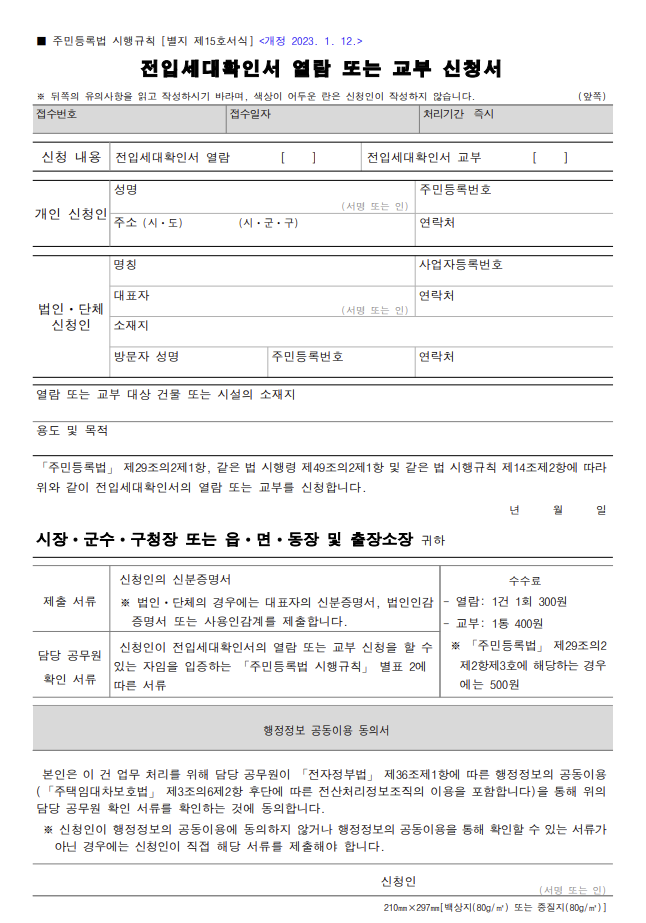 - 임대차계약서 또는 매매계약서, 경매 관련 문서 등 이해관계를 증명할 수 있는 계약서류 준비