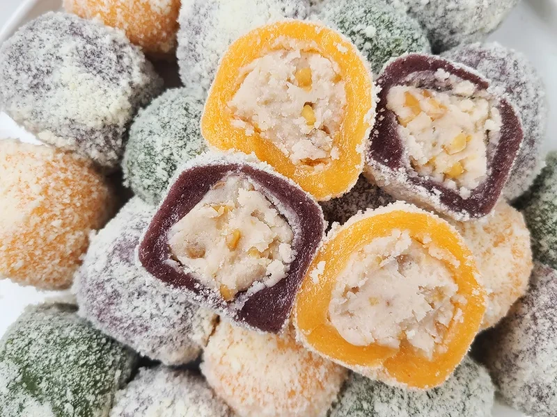- 흰떡 안에 팥·콩·잣·대추 같은 다양한 소를 넣어 만든 고급 떡입니다.