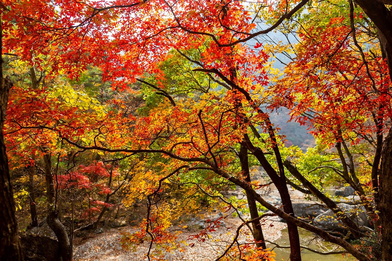 이 시기에는 주왕산 전역이 붉은빛으로 물들며, 특히 제1폭포에서 제3폭포까지 이어지는 계곡길은 절정을 맞은 단풍잎이 폭포수와 어우러져 가히 환상적인 장관을 연출합니다. 주왕산의 단풍은 붉은 단풍나무와 노란 느티나무, 초록빛 소나무가 어우러져 다채로운 색의 조화를 이루며, 일교차가 크고 일조량이 풍부한 만큼 색이 선명하고 깊게 나타나는 것이 특징입니다.
