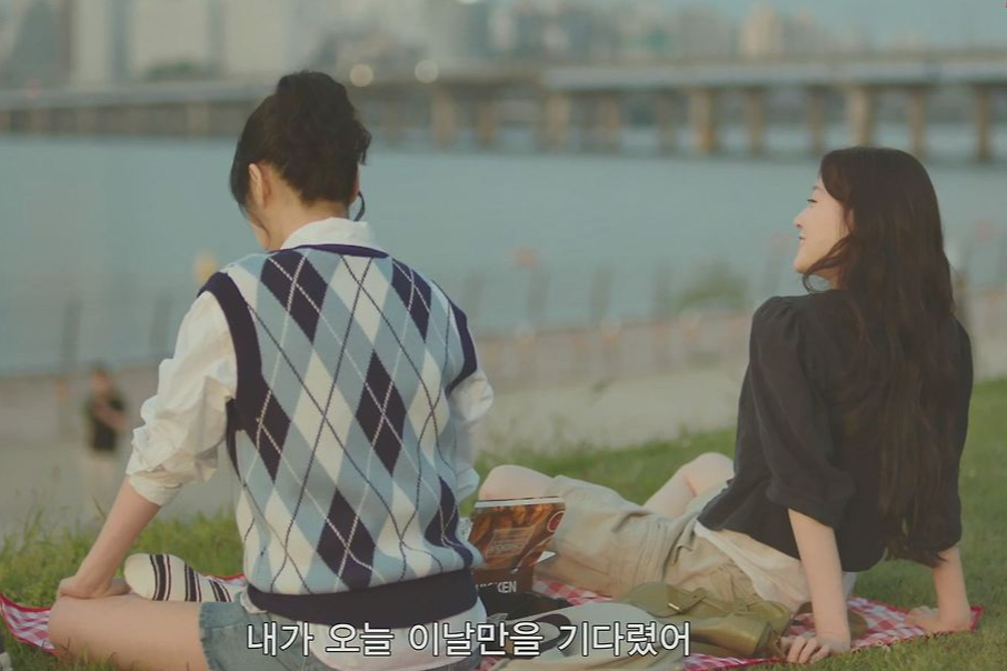 - 장면 설명: 장을 본 뒤 바닷가 벤치에 앉아 쉬는 장면.