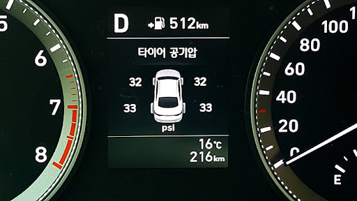 • 현대 그랜저 타이어 공기압 적정 범위: 전륜 34psi(235kPa) / 후륜 36psi(250kPa)