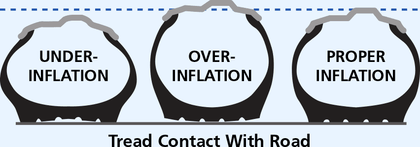 2. 타이어 마모 가속화 - 타이어의 양쪽 어깨 부분이 과도하게 닳게 되며, 중심부는 덜 닳아 불균형 마모가 발생합니다.