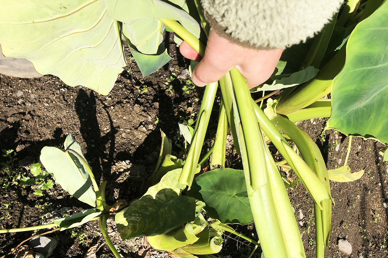 - 토란대를 땅에서 바로 잘라내고, 겉껍질을 살짝 벗겨 흙을 제거합니다.
