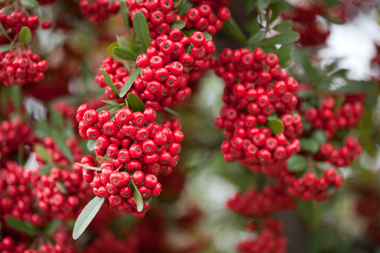 가을부터 겨울까지 피라칸타, 마가목, 낙상홍, 남천, 덜꿩나무 등은 산과 공원, 정원에 붉은색 열매를 매달아 계절의 정취를 더합니다. 이들은 대부분 새의 겨울 먹이로도 중요하며, 조경적 가치가 높습니다. 특히 피라칸타와 낙상홍은 눈 덮인 풍경 속에서 더욱 선명한 붉은색을 띠어 겨울철 풍경 사진의 주요 피사체로도 사랑받습니다.