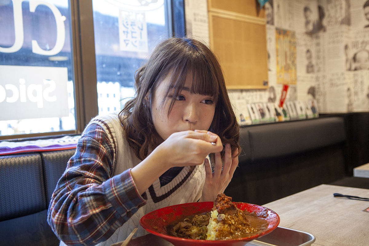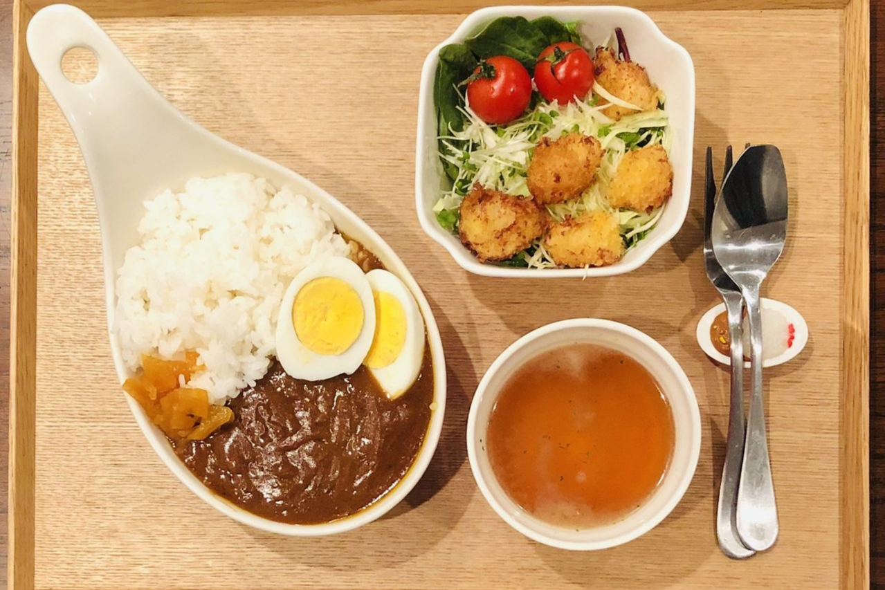 카레라이스는 강황 덕분에 노란색을 띠며 향신료 특유의 깊은 스파이시 풍미가 특징입니다.