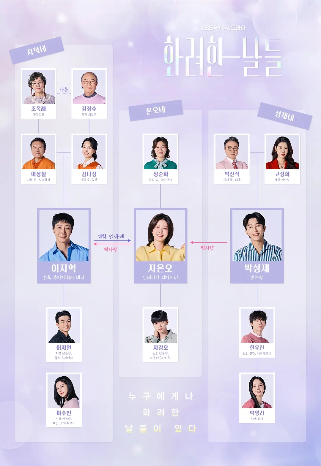 화려한 날들의 인물관계도는 단순한 연애 구도나 혈연 관계를 넘어, 세대와 가치관의 충돌 구조를 중심으로 설계되어 있습니다.