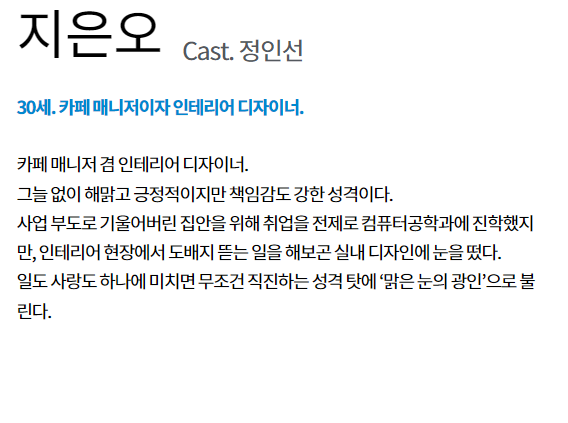 지은오는 인테리어 디자이너로, 밝고 친화적인 성격 덕분에 주변에 사람이 많은 인물입니다. 그러나 감정의 문제 앞에서는 늘 한 발 물러서며, 오랜 짝사랑을 마음속에만 품어온 인물입니다. 이지혁을 향한 감정과 박성재와의 관계 속에서 그는 사랑과 자존감 사이에서 끊임없이 흔들립니다. 지은오는 감정 표현에 서툰 현대인의 모습을 상징하며, 관계 속에서 성장해 나가는 과정을 담당합니다.