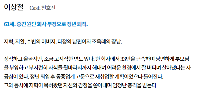 이 외에도 차철민, 조한준, 오수정, 이하은, 조경수 등 다양한 인물들이 각자의 위치에서 현실적인 삶의 단면을 보탭니다.