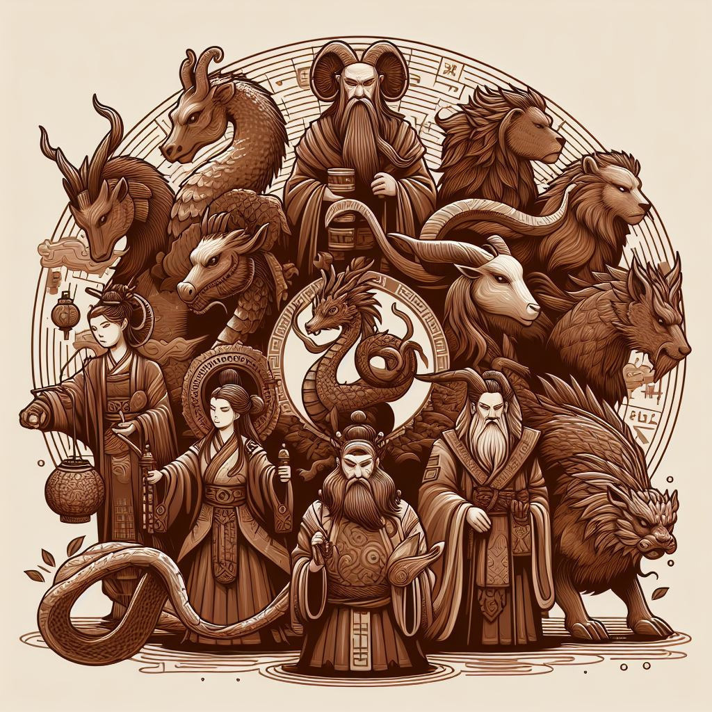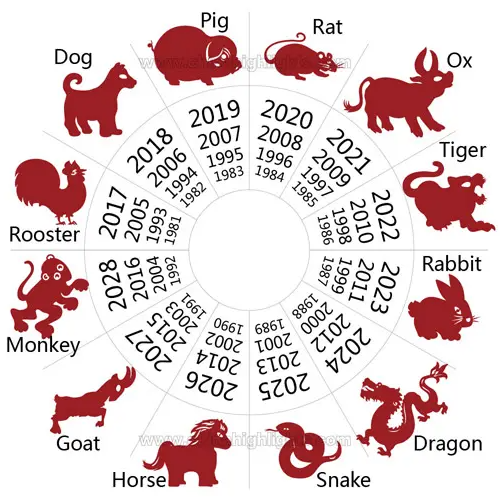 • 쥐, 소, 호랑이, 토끼, 용, 뱀, 말, 양, 원숭이, 닭, 개, 돼지