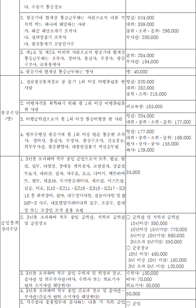 - 항공수당(고정익·회전익·무인기 등 6등급): 670,000원 ~ 1,090,000원