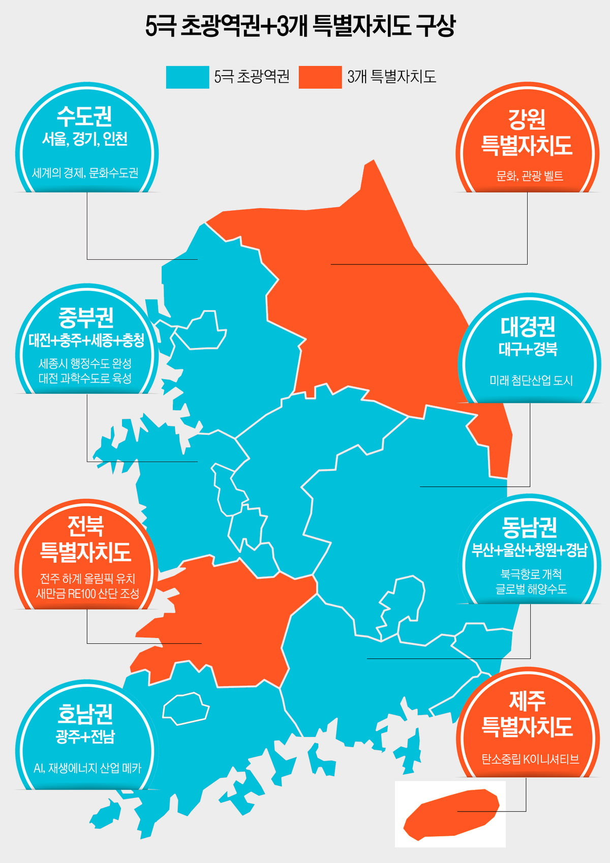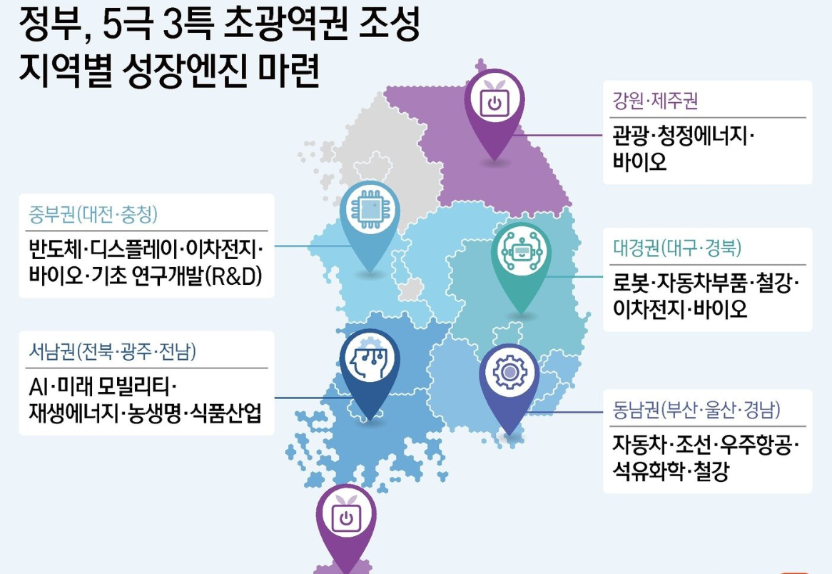 5극 3특이란 전국을 5개의 초광역 경제권(5극)과 3개의 특별자치권(3특)으로 구분해 국토의 성장 축을 다원화하는 발전 전략을 의미합니다.