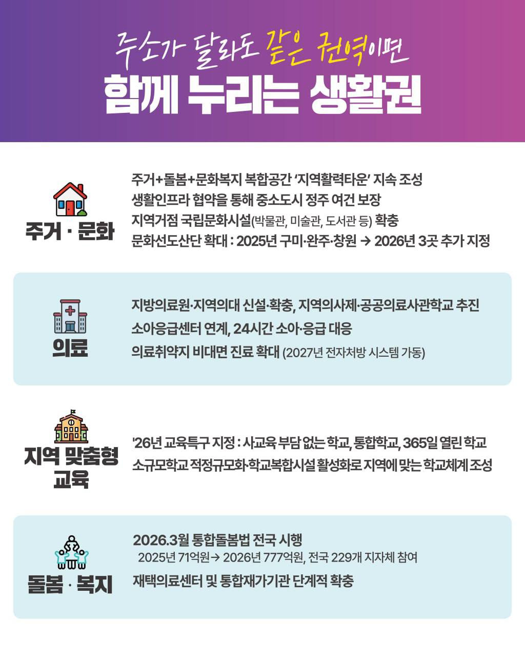 핵심 목적은 수도권 일극 체제에서 벗어나 권역별로 독자적인 성장 동력을 확보하고, 생활권과 경제권이 일치하는 구조를 만드는 데 있습니다. 이를 통해 지역 간 불균형을 완화하고, 국가 전체의 지속 가능한 발전 기반을 구축하는 것이 궁극적인 목표입니다.
